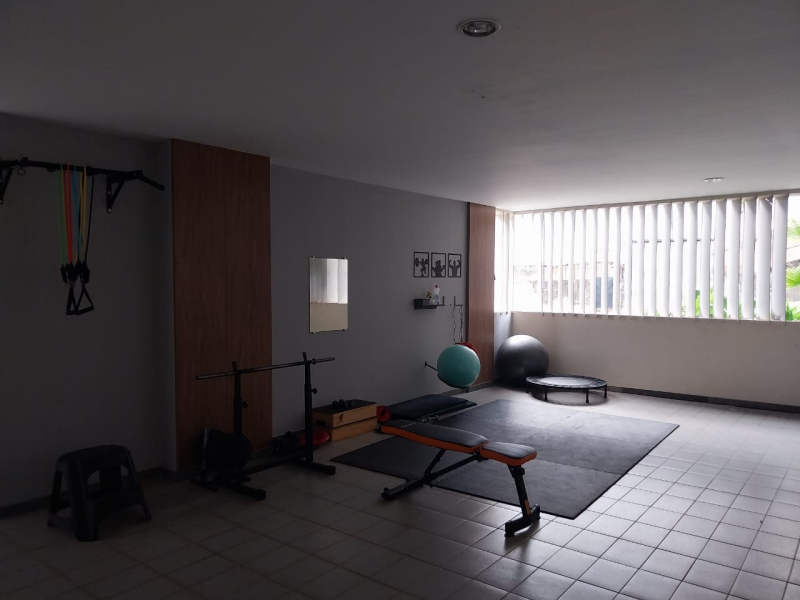 Prédio com elevador, portaria, piscina, playground, salão de festas, mini academia, mercadinho e garagem descoberta.