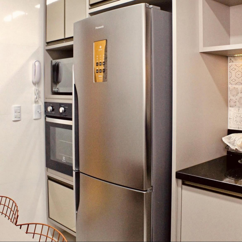 Cozinha com todos os armários embutidos, forno, cooktop, coifa e mesa embutida.;
